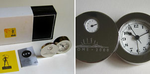 Size: Clock: 4.6cm diameter x 2.3cm (closed), Box: 11.5cm x 9cm x 4.4cm height
