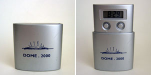 Small travel alarm clock in original packaging. Dual time clock features Dome sketch.