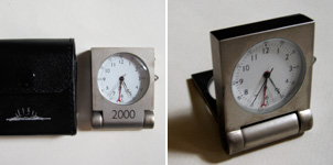 Travel Magny clock in original presentation box with leather pouch. Pouch features Dome sketch. Hinged clock with a magnifying glass cover when folded flat.