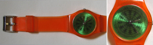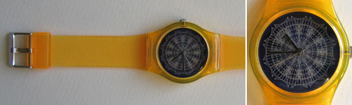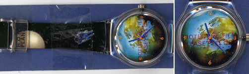 Watch face features Western Europe, wrist band features a satellite, the moon, and space exploration.