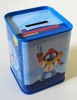 With slot at top to insert coins.