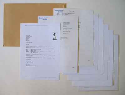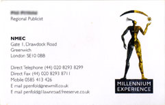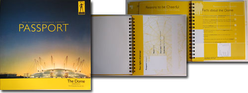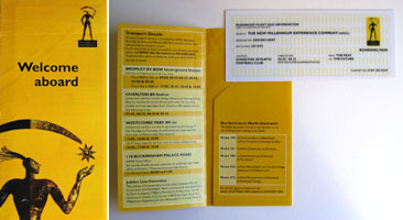 Pocket folder with plasic laminated ticket. Issued to newly hired staff for attendance at the New Millennium Experience Company (NMEC) Assessment Centre. Folder features Transport Details.