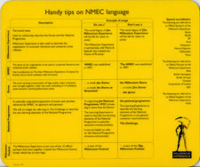 Handy tips on NMEC language. Staff mousemat with descriptions and examples of usage for the Millennium Experience, NMEC, Dome, National Programme, and the Millennium Festival.