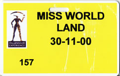 Unlimited access card to all transmission areas for Miss World Land which was located in Skyscape. This November 30th show was the 50th anniversary for the Miss World contest.