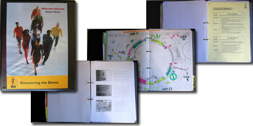Binder with complete documentation on the role of Senior Host. Tabbed sections include: Central Arena, Our Town Story, General Information, Training and Maps. Content includes operating procedures, emergency plans, calendars and training exercises.