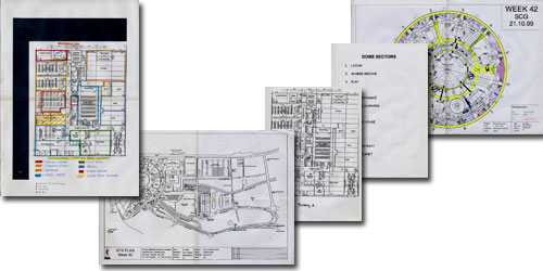Five construction update documents provided to the Millennium Dome's Fire Department prior to the Dome's opening. This set is marked "Week 42 - 21.10.99". The document in the upper left of the photo is a working draft for the placement of fire protection equipment within Building A's departmental staffing area.